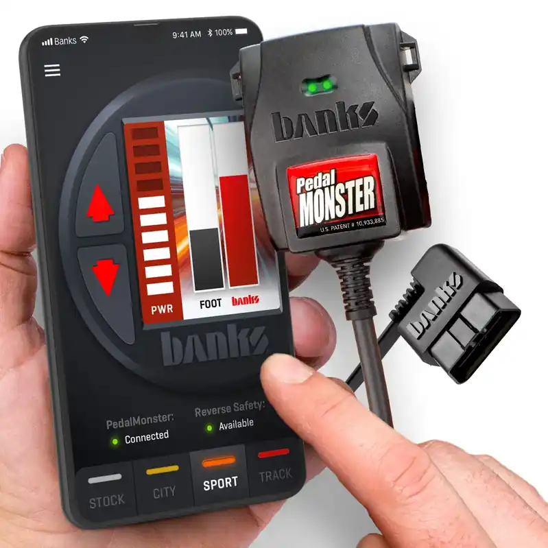 What Is It? PedalMonster is the first OBD-II connected throttle sensitivity controller for gas and diesel vehicles and is tuned to eliminate your factory dead pedal feel and throttle delay. This kit is controlled via the Banks mobile app on your phone or other mobile device (iOS and Android) PedalMonster is the only module of its kind to offer safety features like ActiveSafety, Reverse Safety, and Adjustable Low-Speed Trim. No other throttle booster has the same level of safety, ease of install, and additional features. Key Features: 50-State Emissions Compliant or Pending Simple plug-and-play installation Warranty friendly. Does not leave footprint Powered by +12V via OBD, not low-overhead 5V circuit City, Sport, and Track modes, with 10 sensitivity levels Control and view activity in real-time via iDash and mobile app ActiveSafety, Reverse Safety, and Adjustable Low-Speed Trim Low-Speed Trim controls how fast sensitivity is added at slow speeds US Patent #10,933,885 B1