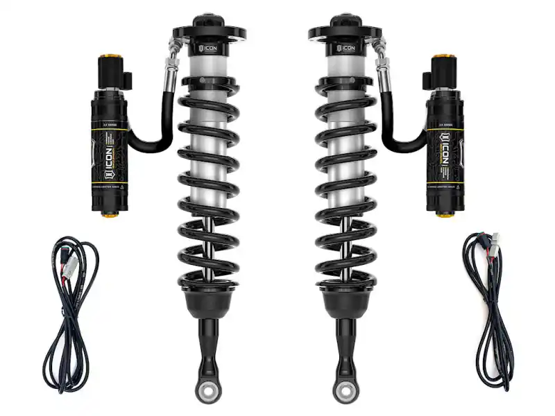 - The ICON Vehicle Dynamics V.S. Series 2.5” remote reservoir coilover shocks w/ CDCV are an incredible upgrade for the front end of the 2014-2021 Toyota Tundra. ICON’s Vehicle-specific valving provides a sport tuned feel on and off-road while offering 1-3” of lift height adjustability for use of larger, more aggressive wheel and tire combinations. ICON’s larger 2.5” shock body and increased piston area over stock components provides improved damping ability and outstanding ride characteristics across varying types of terrain. Remote reservoirs ensure optimum performance by increasing the duration of consistent damping regardless of situation, keeping the shocks at a cooler operating temperature during heavy use. The ICON CDE Valve upgrade is included for those desiring an easy way to tune the ride electronically from inside the vehicle.