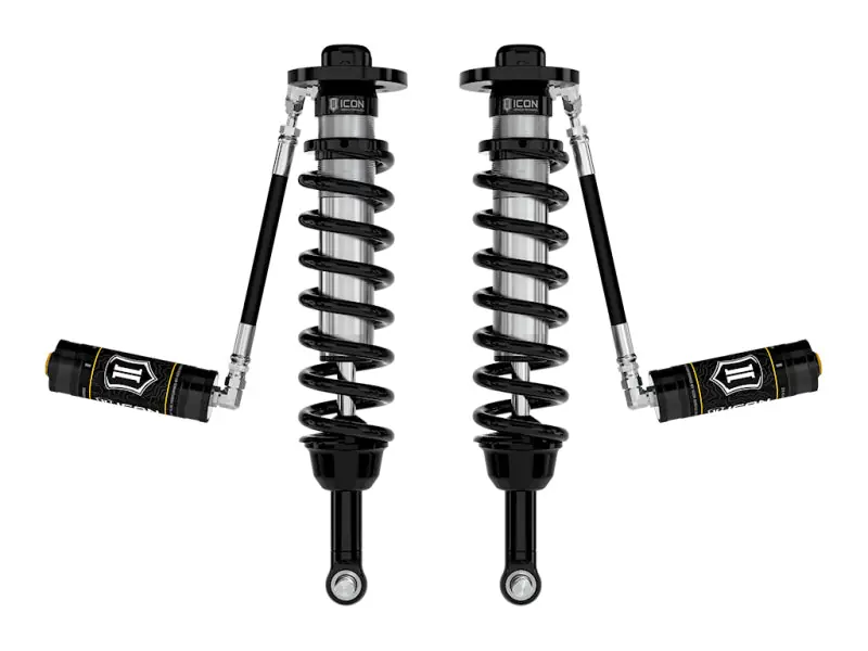 ICON Vehicle Dynamics V.S. Series 2.5” coilover shocks are an incredible upgrade for the front end of 2021-2024 Ford F-150 4WD trucks. ICON’s Vehicle-specific valving provides a sport tuned feel on and off-road while 2.75-3.5” of lift height adjustability allows the use of larger, more aggressive wheel and tire combinations. The larger 2.5” shock body and increased piston area over stock components provides improved damping ability and outstanding ride characteristics across varying types of terrain. Remote reservoirs ensure optimum performance by increasing the duration of consistent damping regardless of situation, keeping the shocks at a cooler operating temperature during heavy use. When paired with ICON rear 2.0 Aluminum Series or 2.5 Series shocks vehicle control will be balanced front to rear, resulting in the best overall driving experience for your F-150 truck.