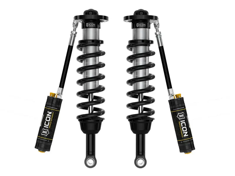 ICON Vehicle Dynamics V.S. 2.5 Series remote reservoir front coilover shocks are an incredible upgrade for the front end of the 2022-2024 Toyota Tundra. These adjustable coilovers are specifically designed for use the ICON 6″ Lift Performance Suspension System and allow up to 5-6” of front lift height adjustability, allowing the use of larger, more aggressive wheel and tire combinations. ICON’s Vehicle-specific shock length and valving along with the larger 2.5” shock body and increased piston area over stock components yield the maximum travel possible along with superior ride quality and suspension performance both on- and off-road. Reservoirs greatly increase shock oil volume and heat dissipation surface area to resist overheating and cavitation under hard use, which can lead to damper fade. ICON’s exclusive Compression Damping Control Valves are included for precisely dialing in your suspension performance. CDCV controls fluid flow under compression, allowing you to achieve the perfect tune whether driving on the street, slow-crawling through the rocks or mobbing across the desert at full throttle. When paired with ICON 2.0 or 2.5 Aluminum Series rear shock absorbers vehicle control will be balanced front to rear, resulting in the best overall driving experience for your Toyota Tundra.